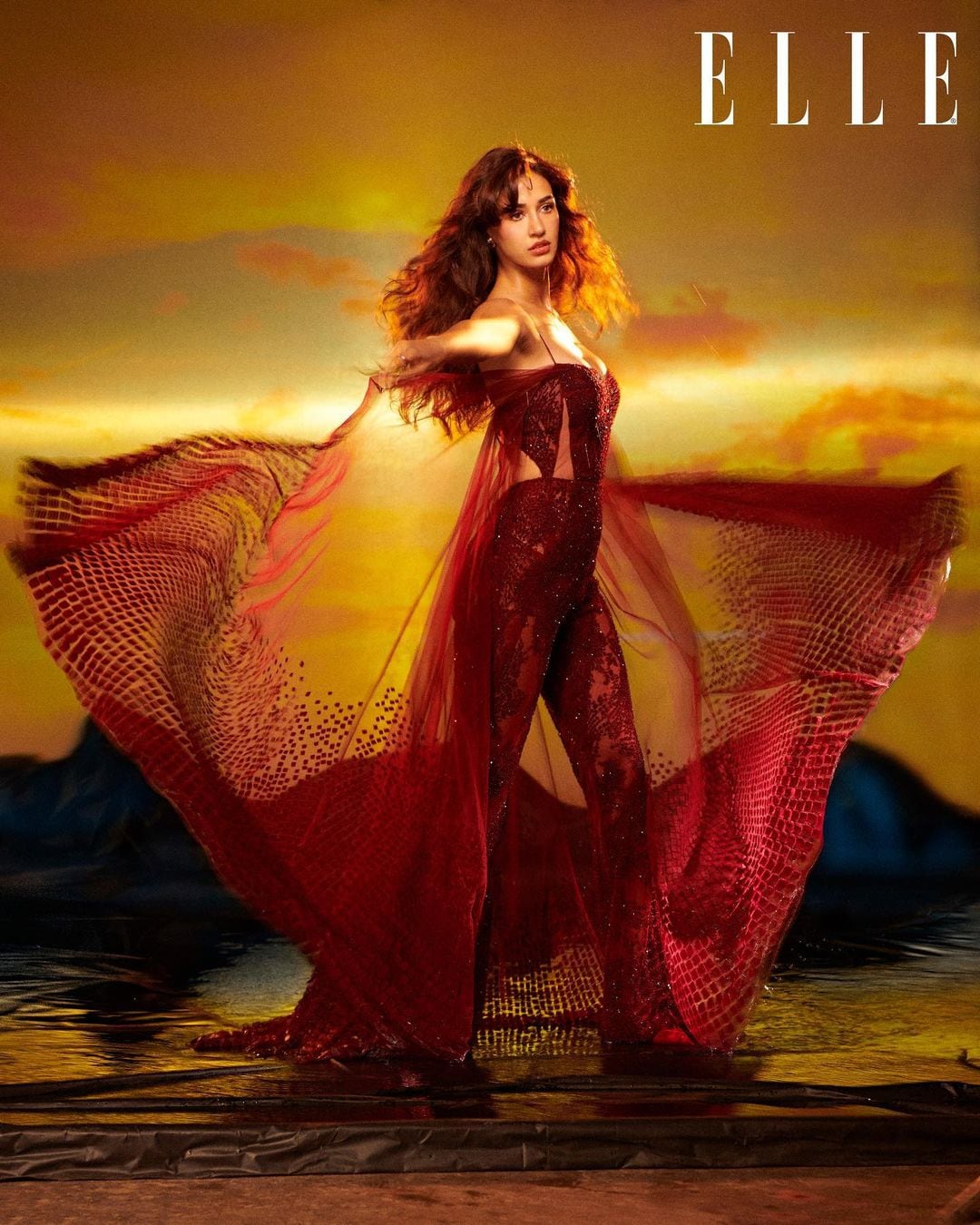 Disha Patani cuts a statusque figure in a red caped jumpsuit.