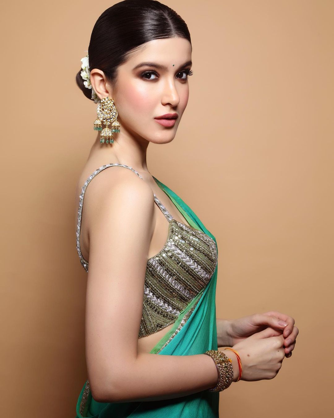 Shanaya Kapoor pairs the saree with a beaded blouse