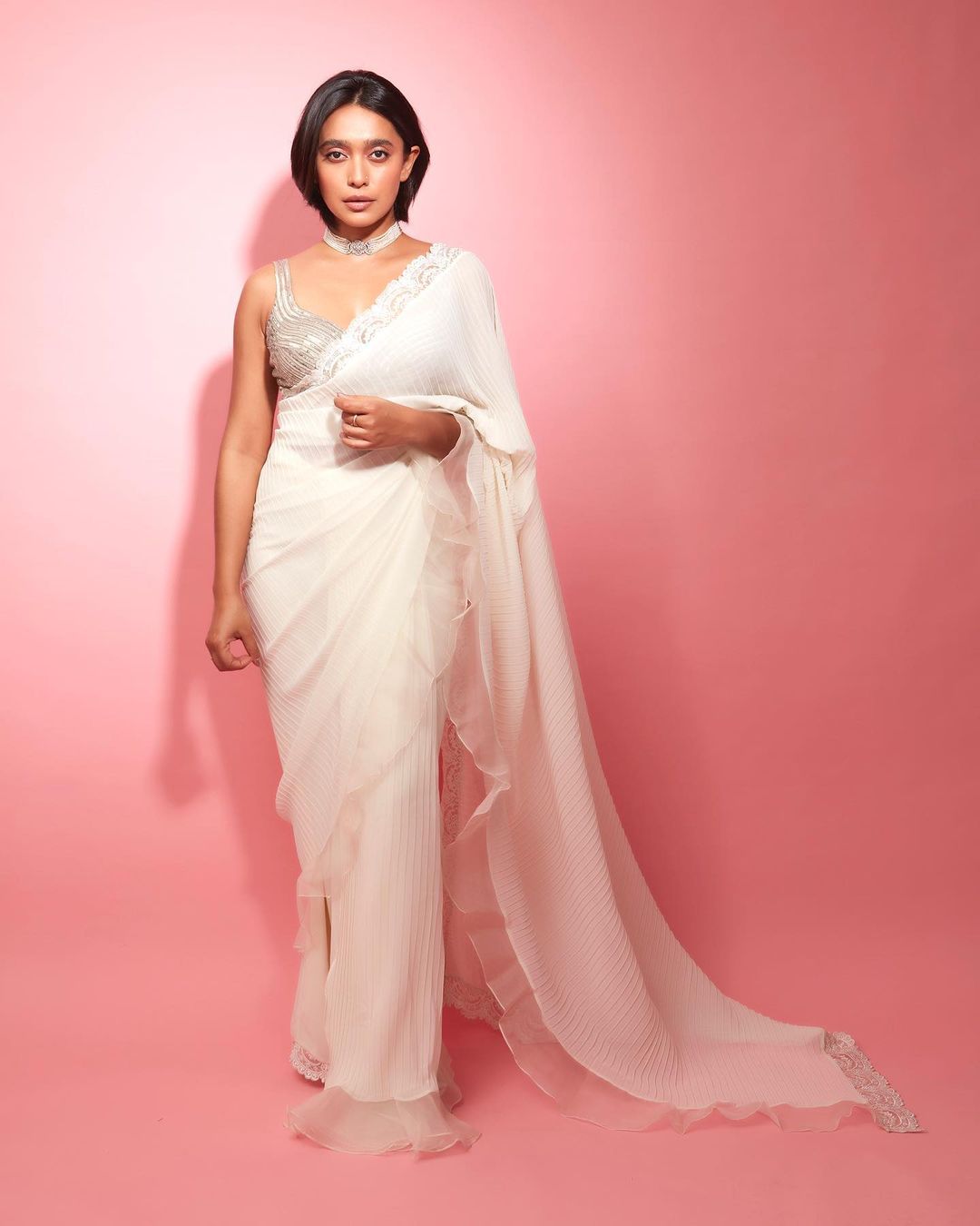 Sayani Gupta looks graceful in a plain white chiffon saree