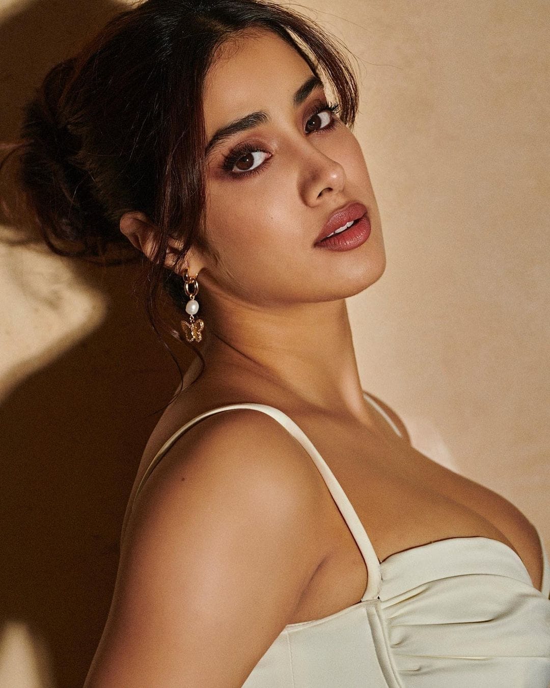 Janhvi Kapoor accessorises the look with a pair of dainty butterfly earrings