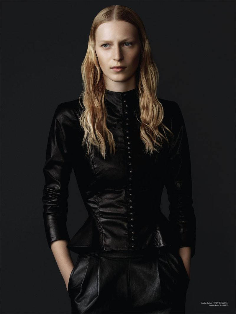 A Wonderful Monochromatic Shot Of Julia Nobis As She Models A Black Leather Jacket And An All-black Outfit.