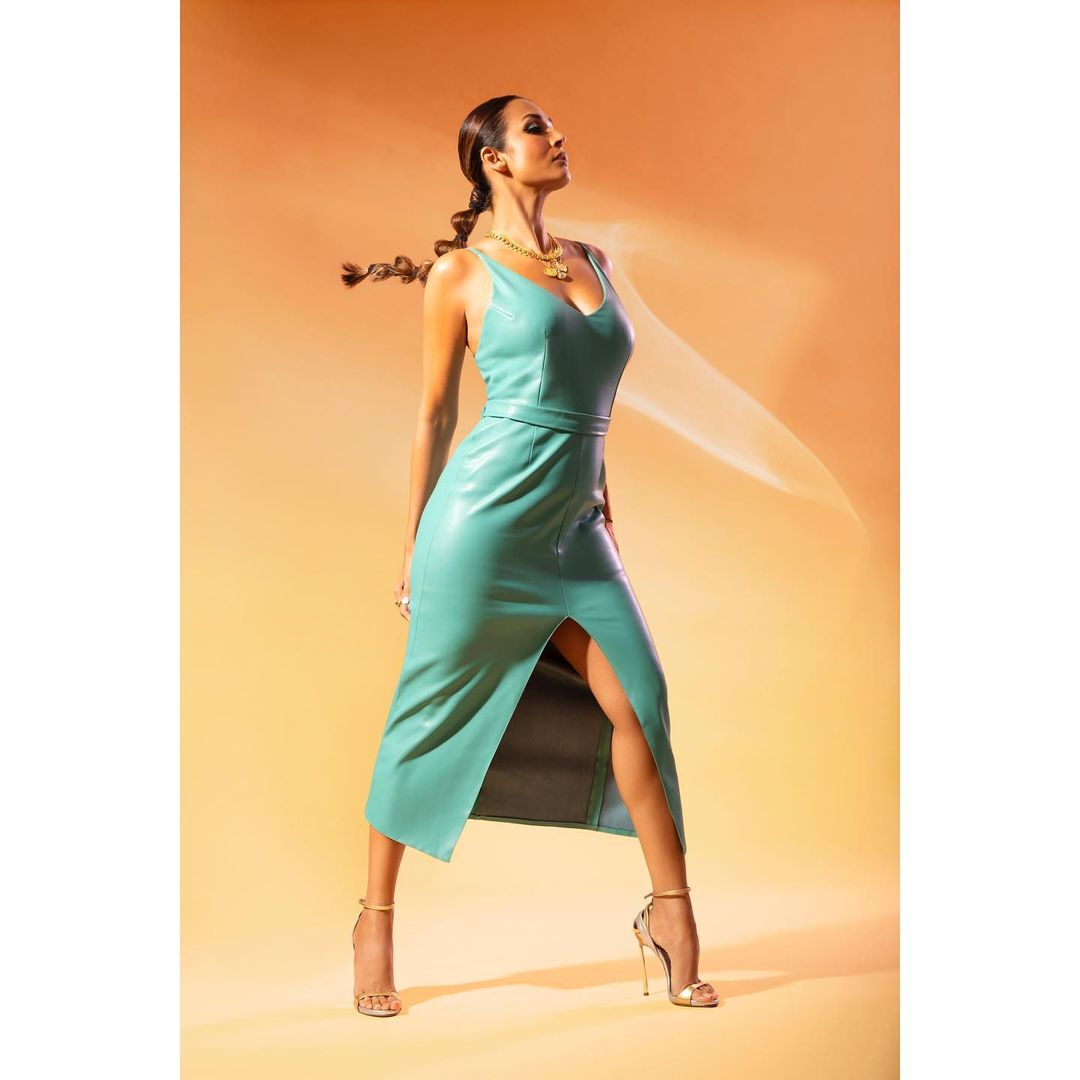 Malaika Arora strikes a pose in the blue leather dress
