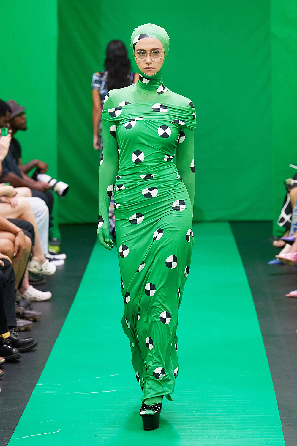 Ella Emhoff walks the NYFW Maisie Wilen Fashion Show. She wore a green gown with black and white patterns.
