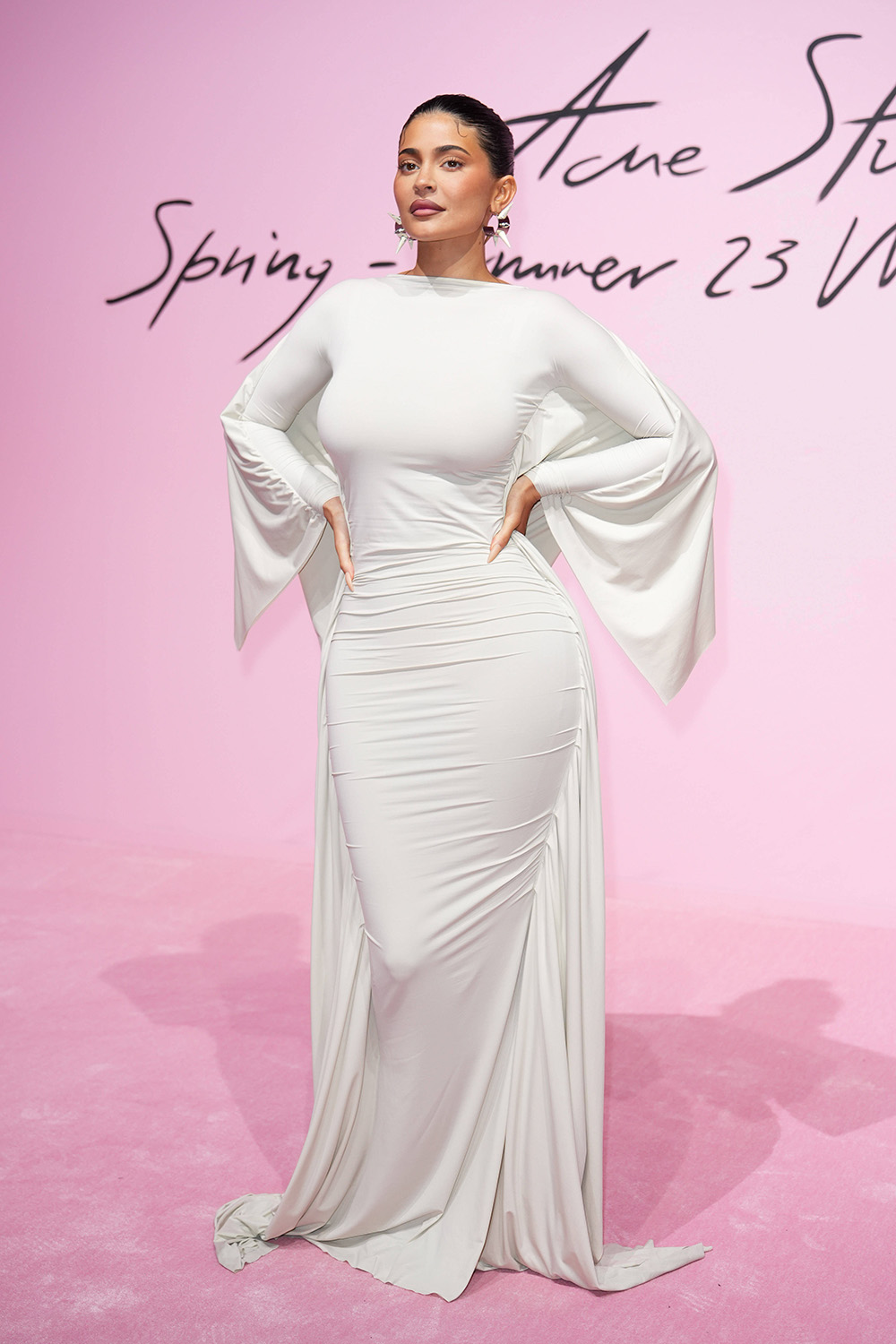 Kylie Jenner stunned in a flowy, full-length white gown while attending ACNE’s Paris Fashion Week show