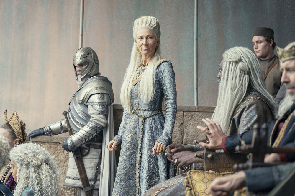 Eve Best plays Rhaenys Velaryon. Rhaenys is the daughter of Prince Aemon and is married to Lord Corlys Velaryon.
