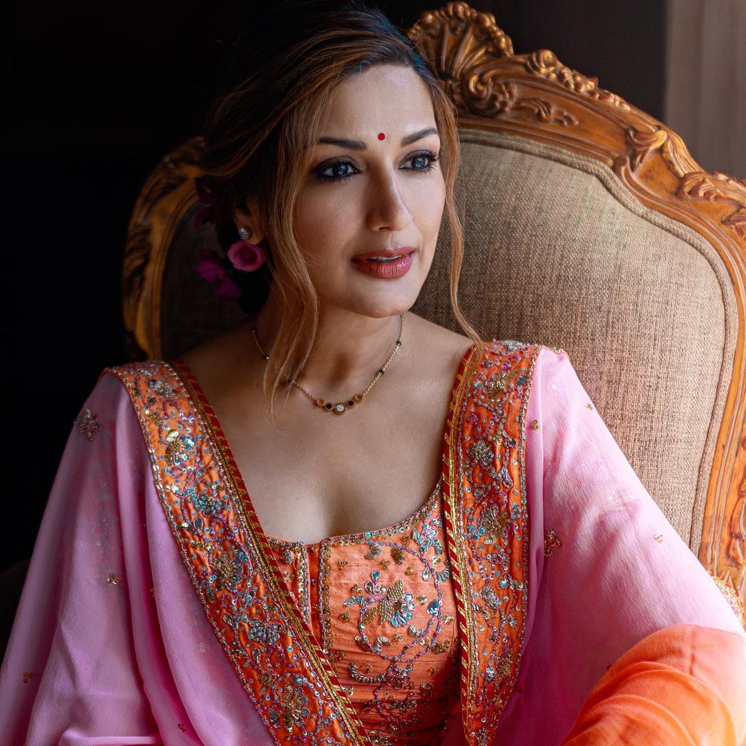 Sonali Bendre looked graceful in an orange and pink lehenga, which was incidentally her wedding lehenga