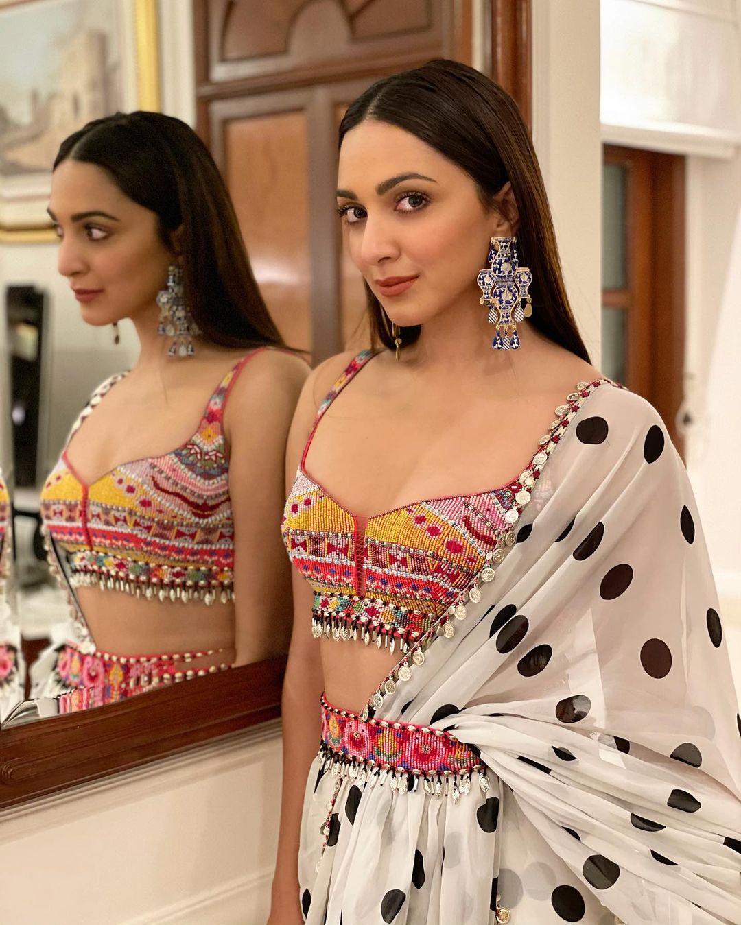 Kiara Advani pairs the chiffon polka dot saree with a multicoloured beaded blouse