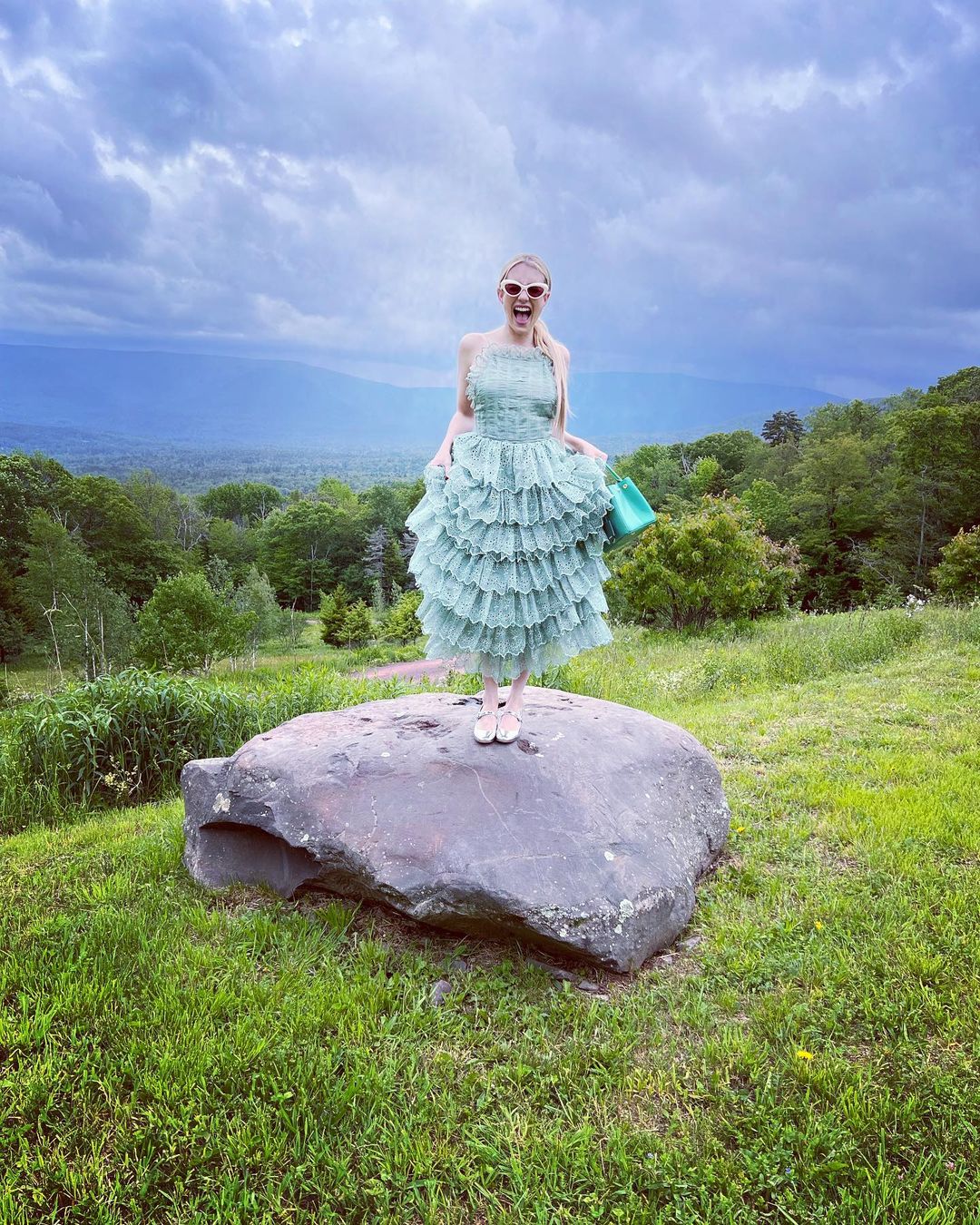 Emma Roberts strikes a silly pose on a rock