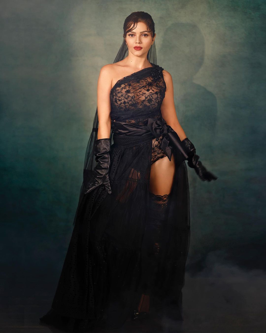 Rubina Dilaik oozed glamour in the semi-sheer black look, complete with gloves and a veil.