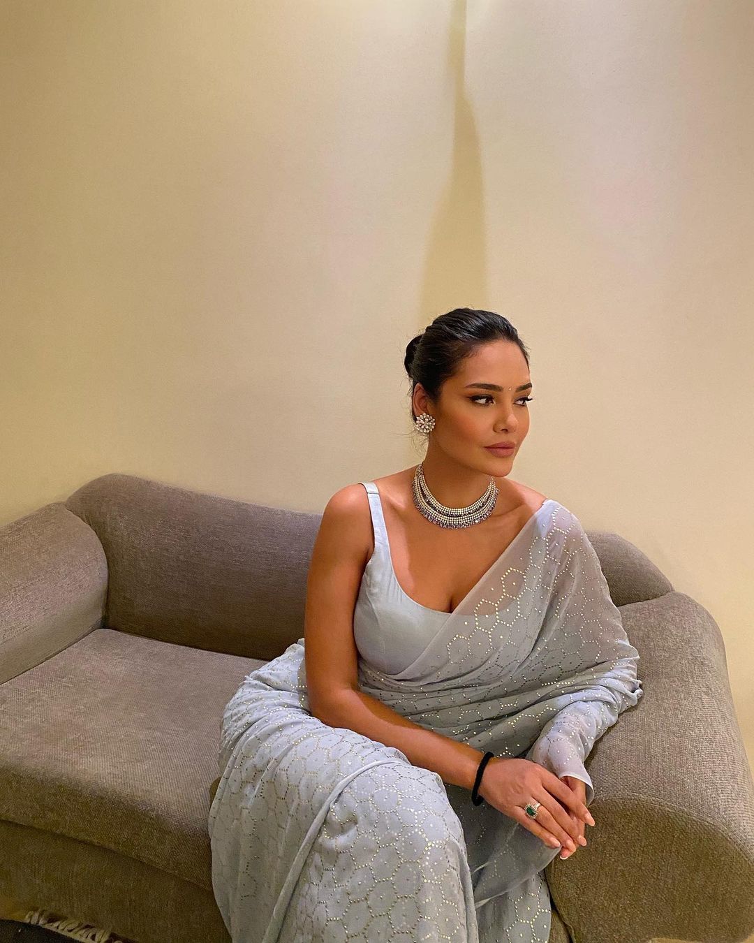 • Esha Gupta looks stunning in the pastel blue saree