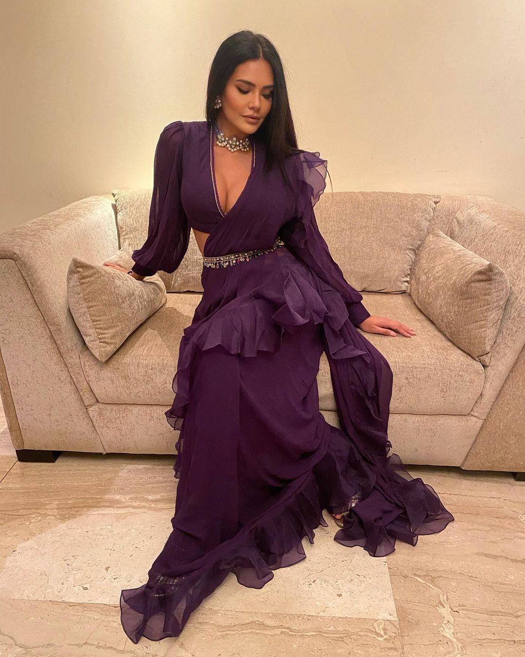 Esha Gupta flaunts her curves in the purple ruffled saree