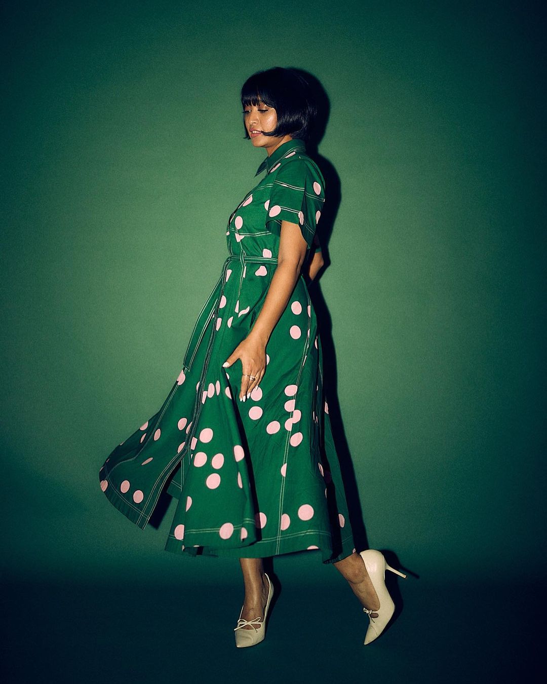 Sayani Gupta looks smart in a polka-dotted green midi dress