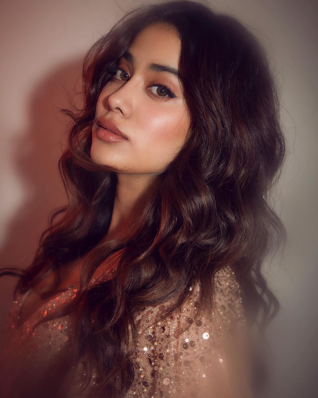 Janhvi Kapoor rounds off her entire look with perfectly-lined eyeliner, glossy lips and blushed cheeks