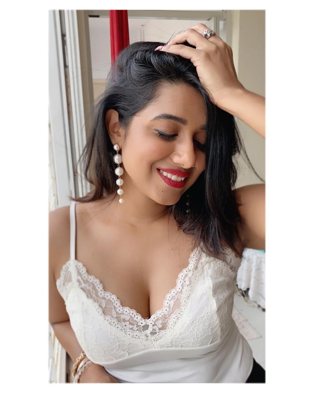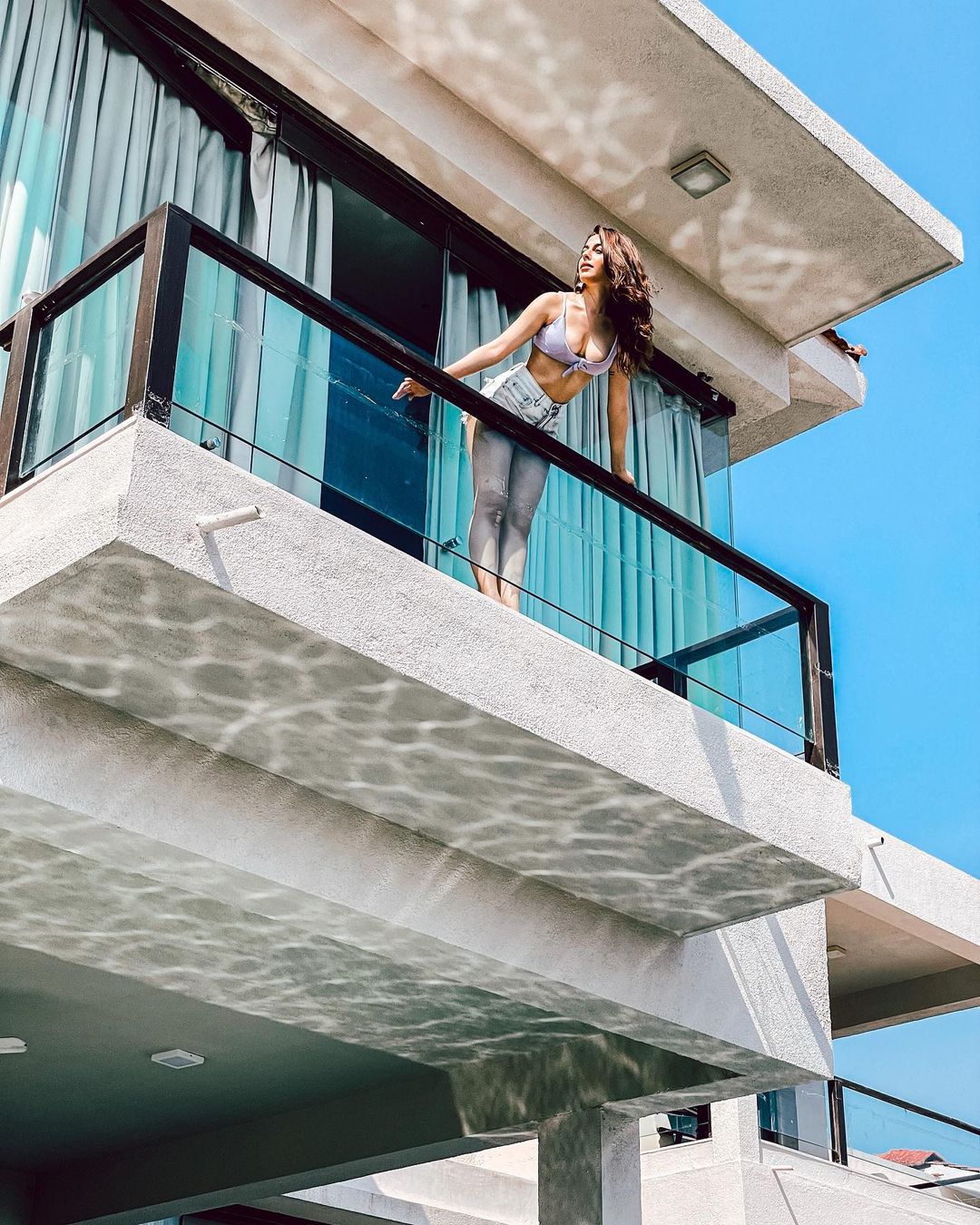 Alaya F shows off her cleavage as she leans on a balcony in a sexy blouse paired with denim shorts