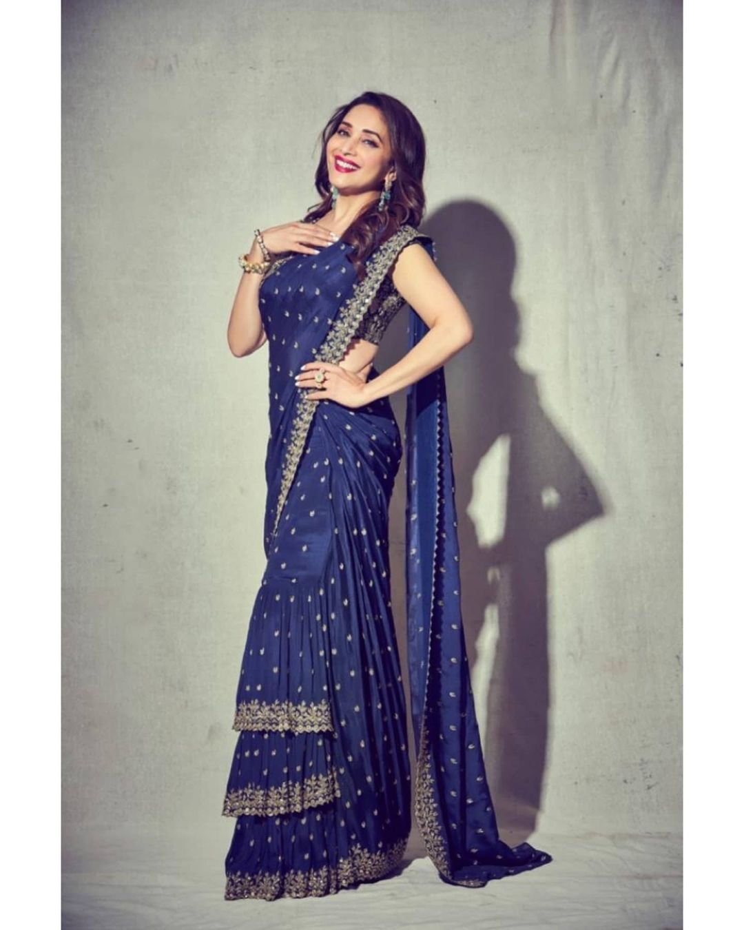 Madhuri Dixit keeps it playful in the stitched tiered saree