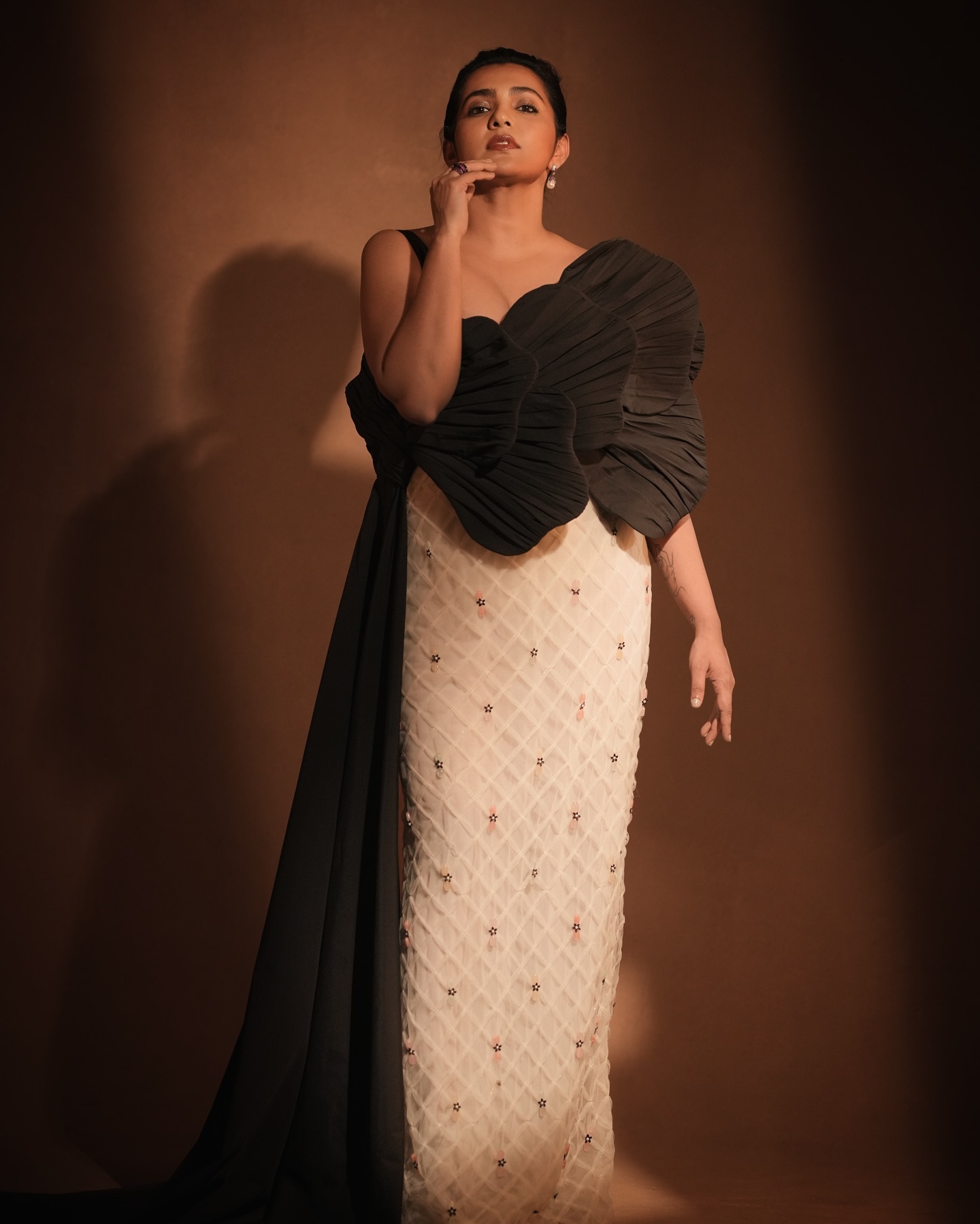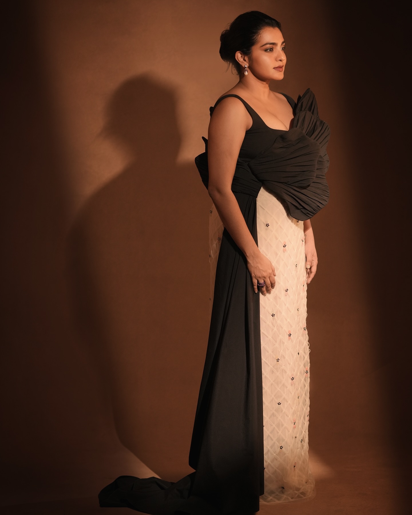 In the image, Parvathy wore a chic black and white dress paired with elegant jewels.