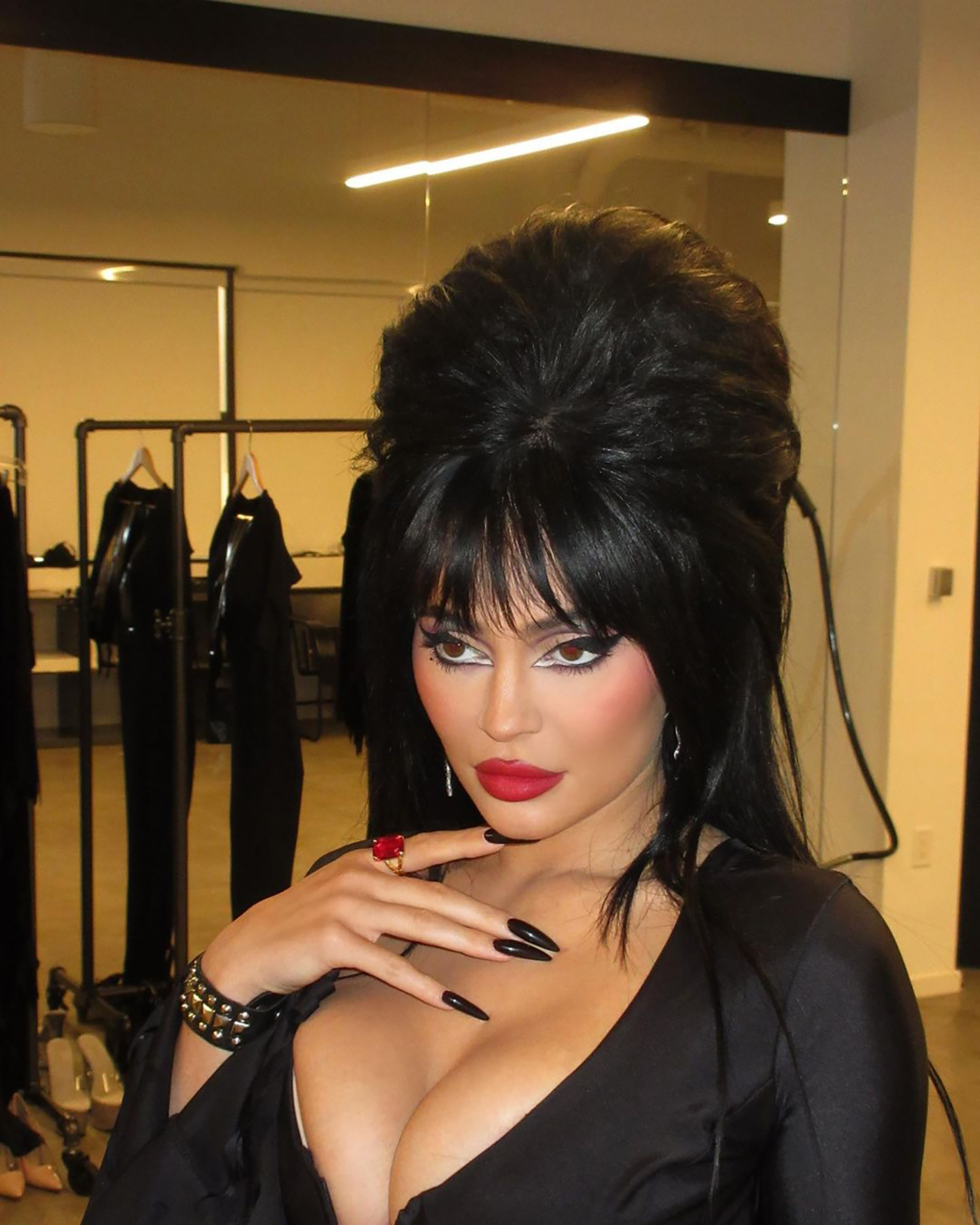 • Jenner rocked a plunging black dress much like Elvira's iconic costume