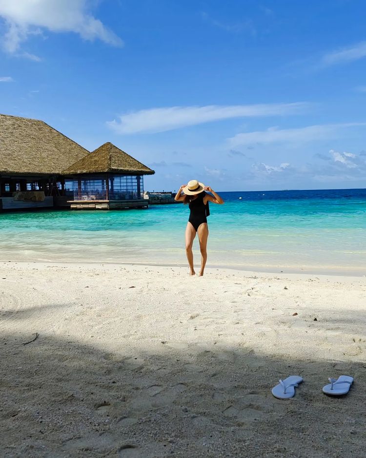 • Shama Sikander is giving summer vibes in a black and blue swimsuit.