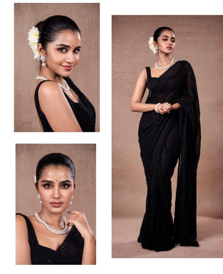 • Anupama Parameswaran’s sleeveless, sweetheart-neckline velvet fabric blouse features a sequin embellishment. Pair it with a sequin-embellished black saree to let the details shine. Keep accessories minimal and opt for soft, minimal makeup.