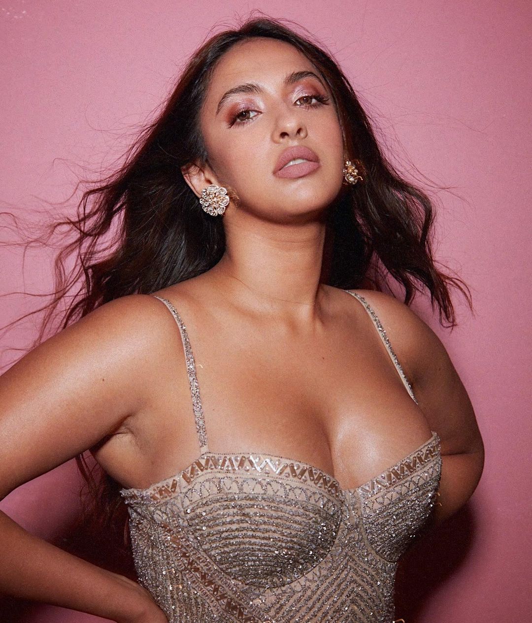 Akansha Ranjan Kapoor flaunts her curvaceous figure in a figure-hugging gown with a plunging neckline