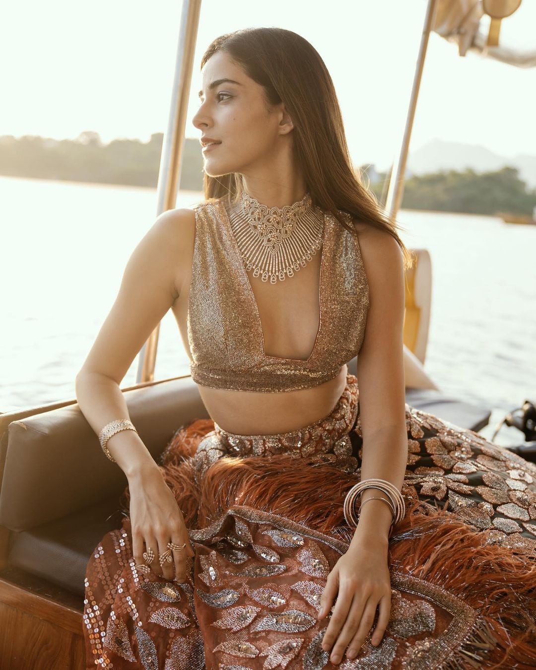 • Ananya Panday looks stunning in the embellished choli with the plain lehenga