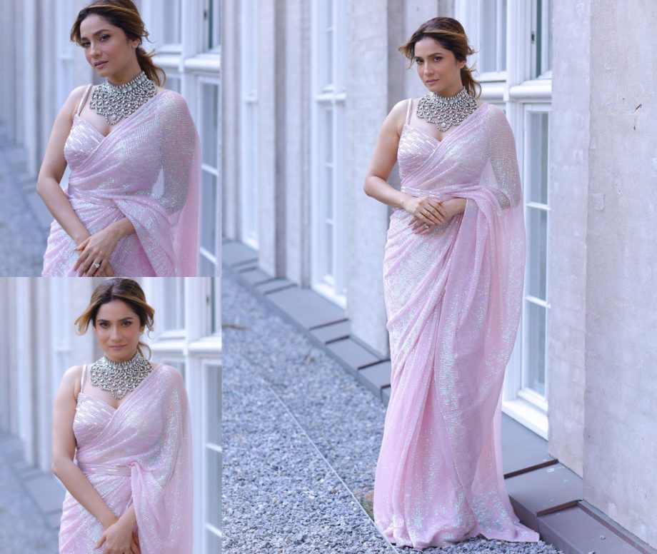 Ankita Lokhande looks glamorous in a blush pink sheer saree with sophisticated detailed silver cutwork along the pallu. Her sleeveless deep neckline blouse has intricate embroidery embellishments all over it, giving it an elegant and enhancing overall look.