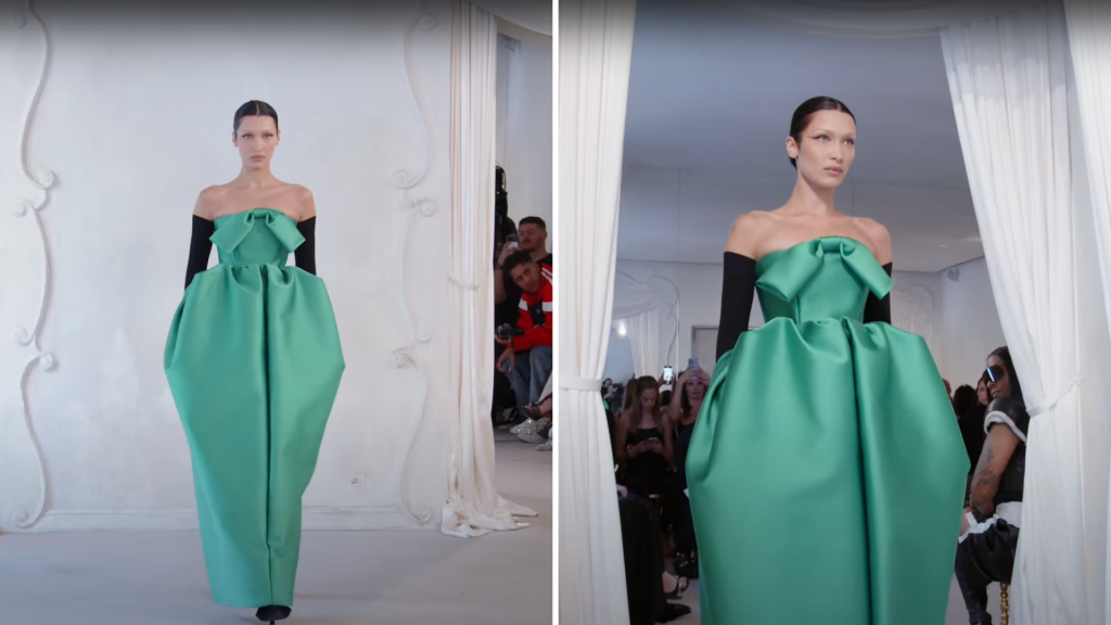 One of the few looks with a pop of colour, Bella Hadid walked in a satin silk green bustier gown with bow detailing.