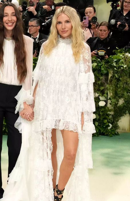 Sienna Miller wears tiered white lace with studded heels.