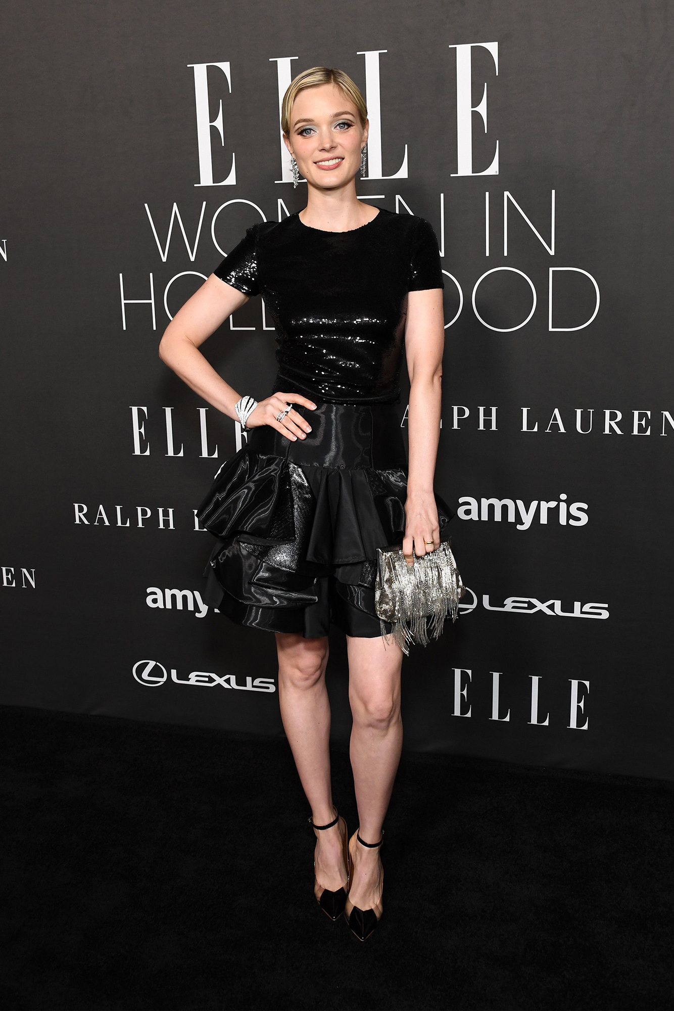 Bella Heathcote wears Ralph Lauren Collection at the Elle Women in Hollywood 2022 celebration.