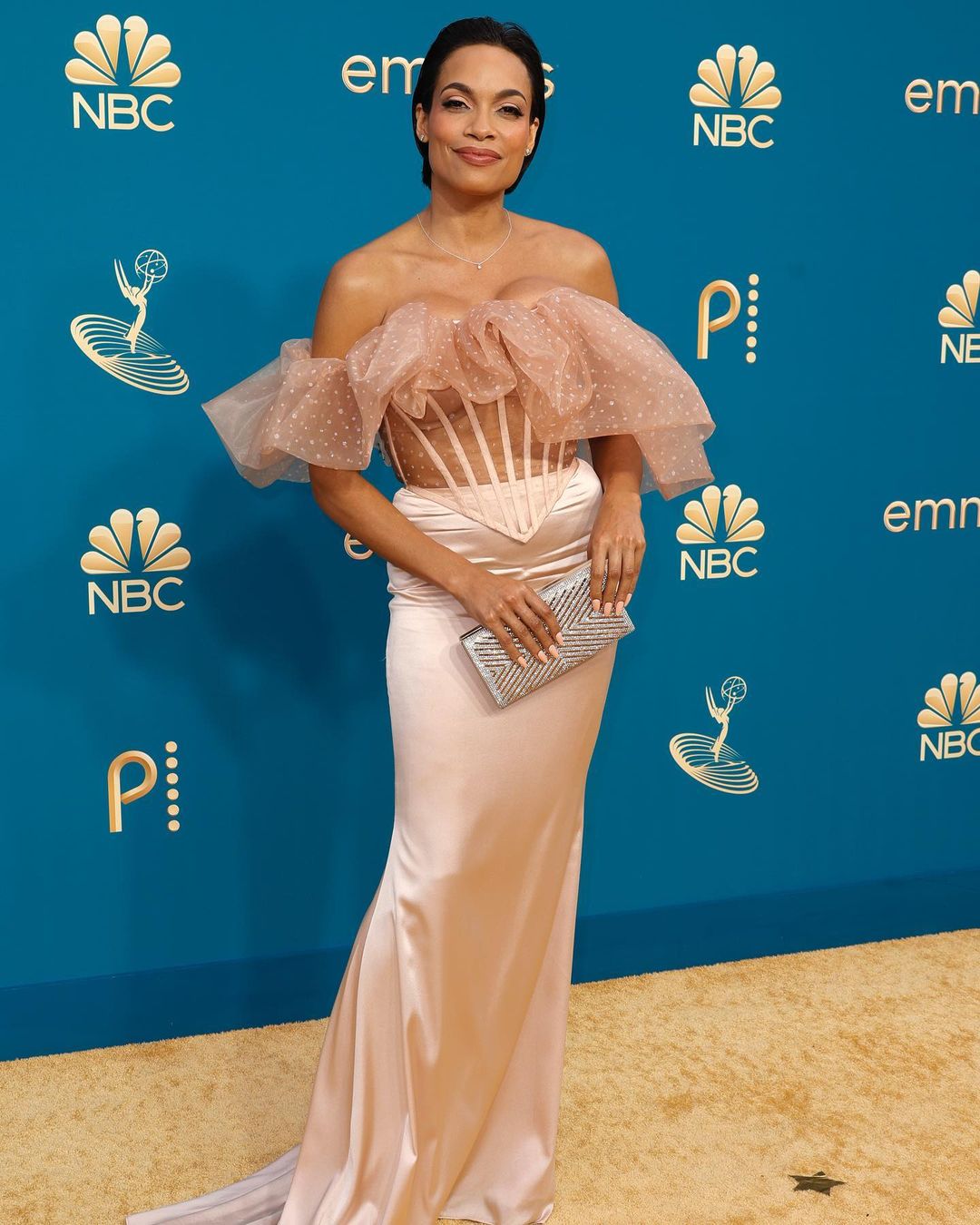 Rosario Dawson looks lovely in a Christian Siriano corset top and satin skirt