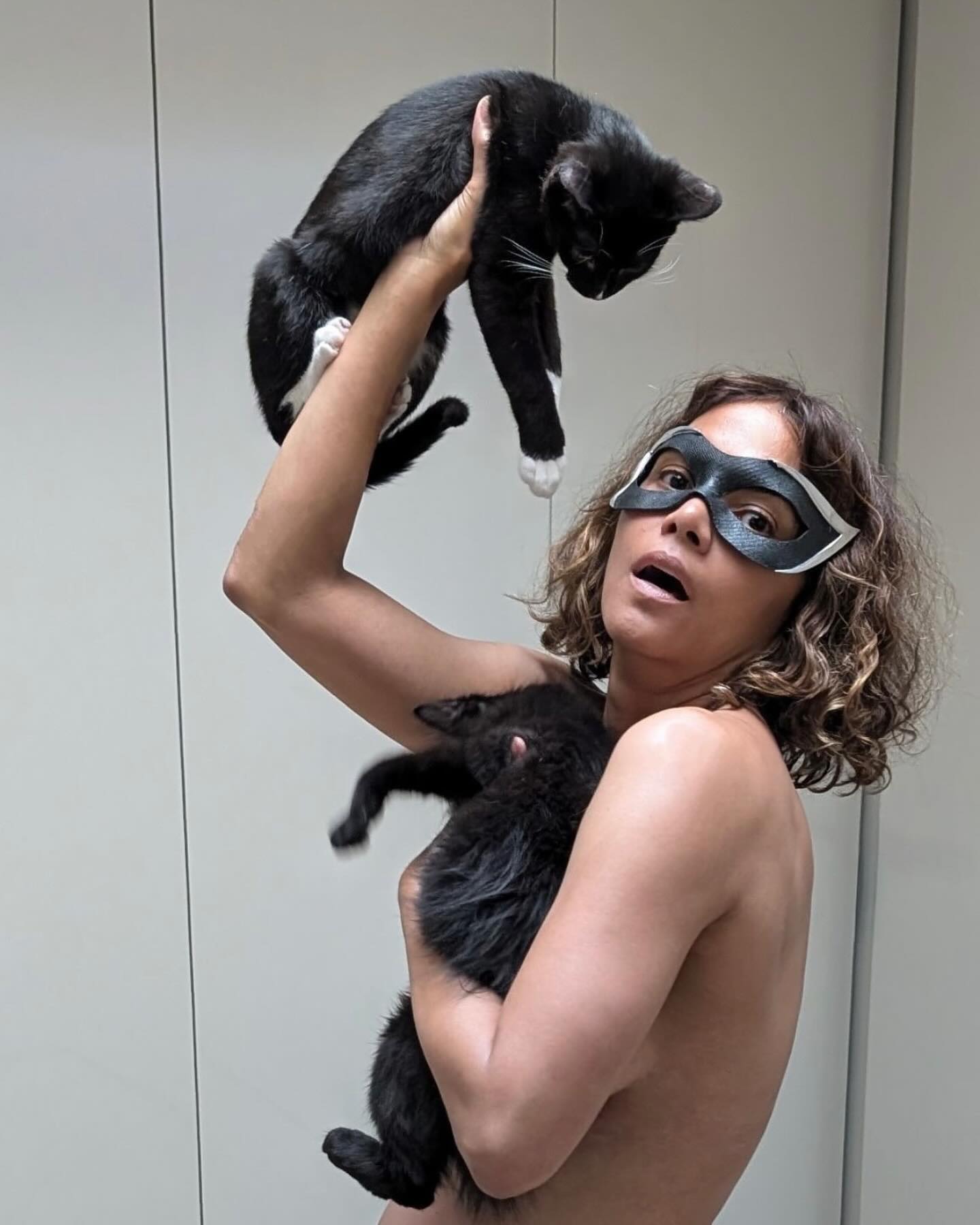 In the snaps, the “Gothika” star ditched her top, wearing only black underwear and a black cat eye mask.