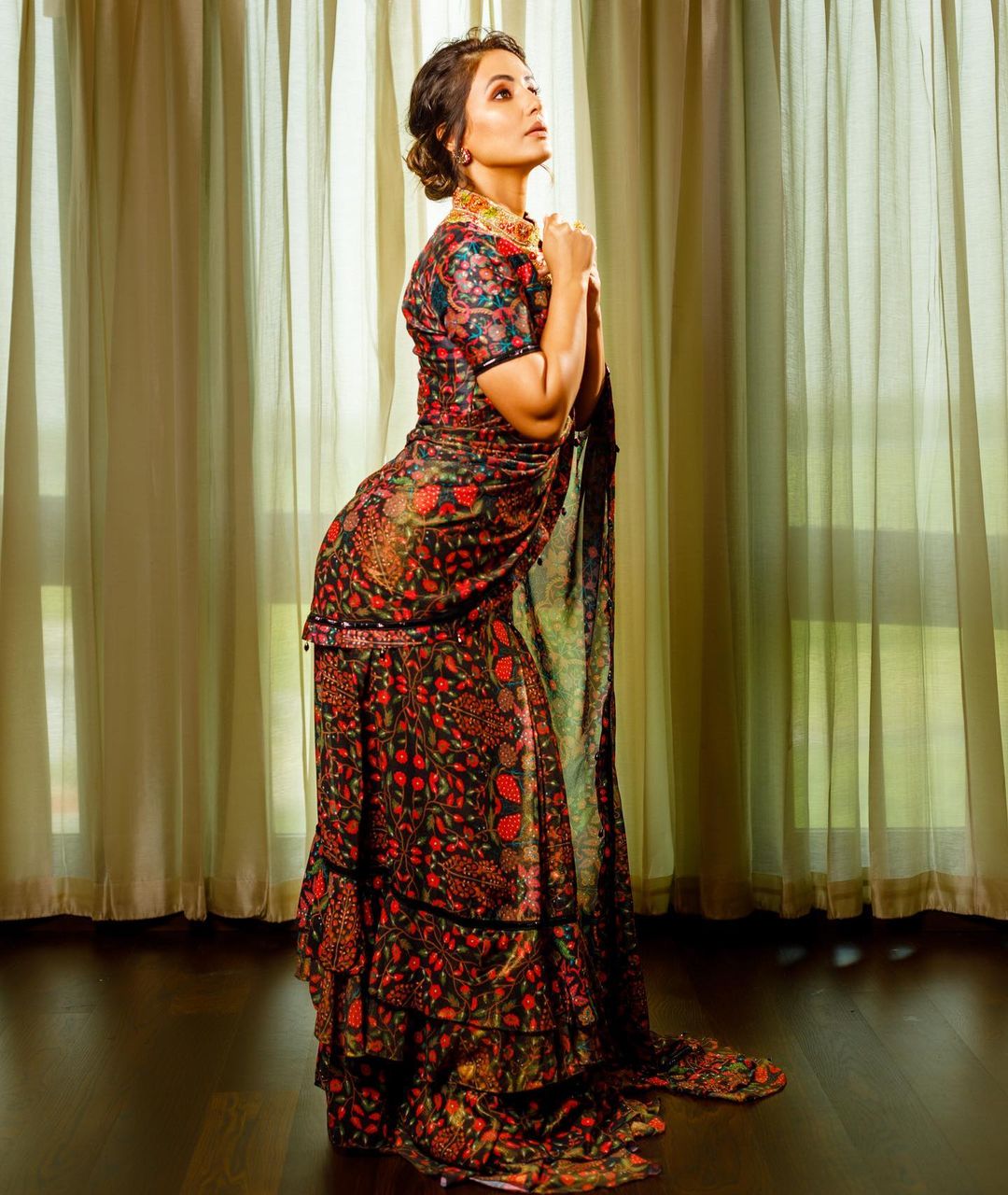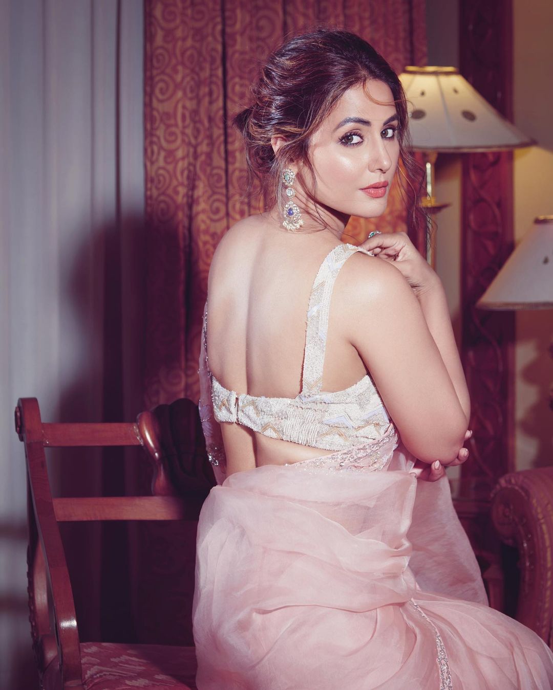 Hina Khan is a picture of elegance in the pastel coloured organza saree.
