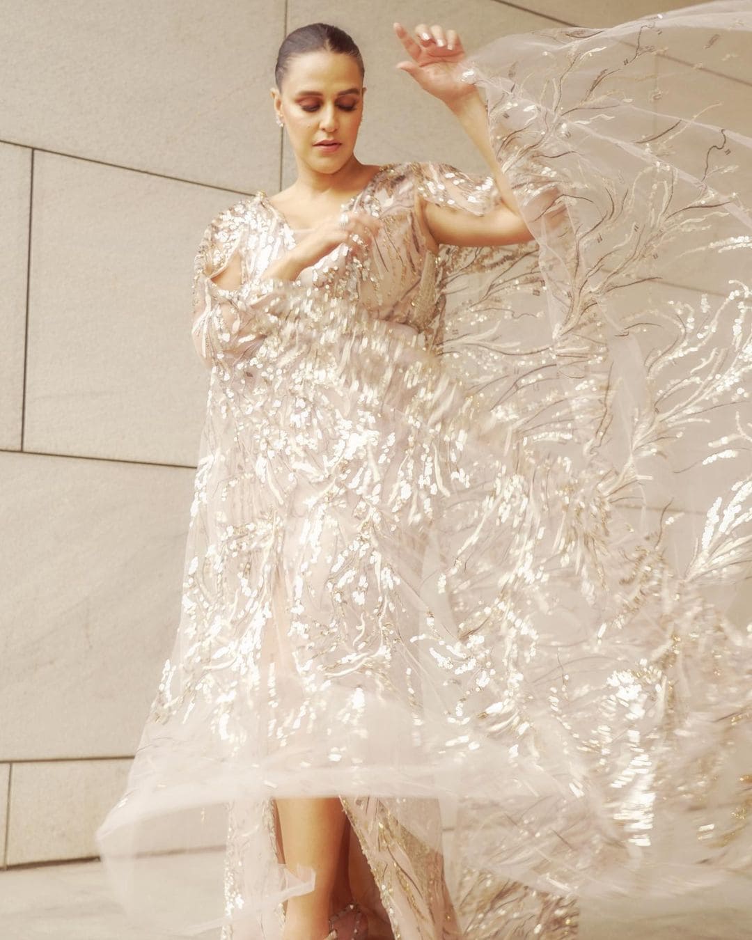 Neha Dhupia opted for a powder pink and gold gown with cape sleeves where she looked stunning