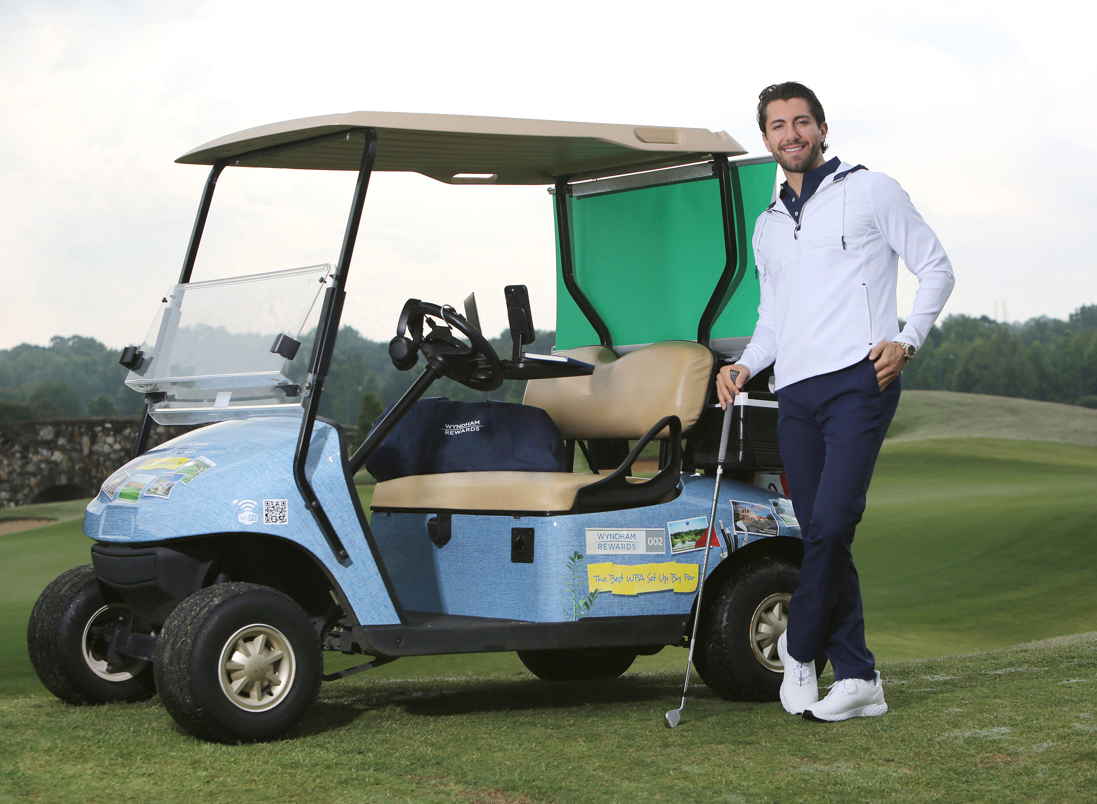 Jason Tartick takes advantage of "working" from anywhere in the new Wyndham Rewards "Cubicle Caddie" golf cart.