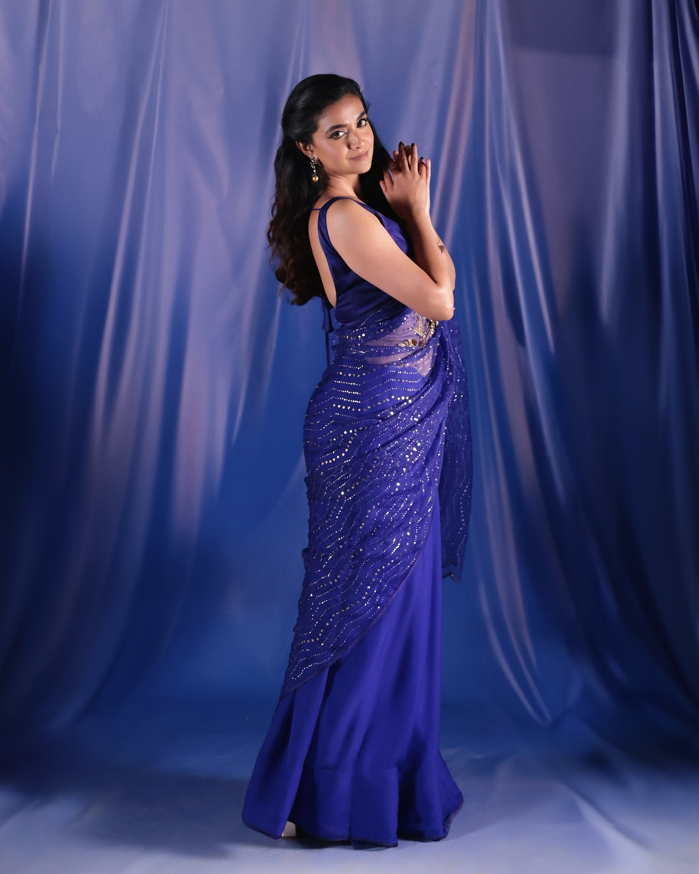 Keerthy Suresh wore this stunning outfit while promoting her latest film, "Raghu Thatha". Her pictures in the blue saree created a buzz on social media, with many admiring her fashion sense.
