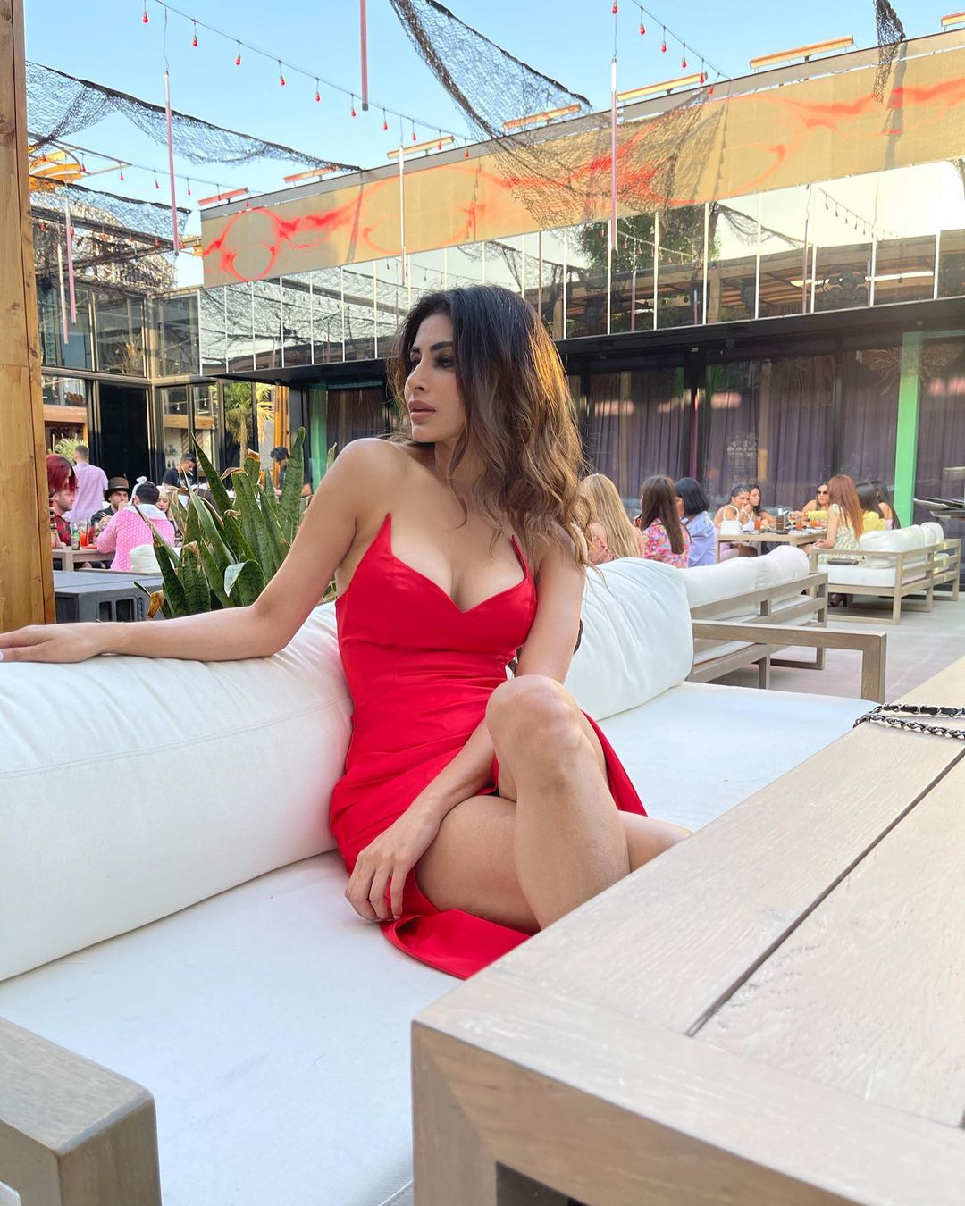 Mouni Roy looks super sexy in the red dress with the thigh-high slit