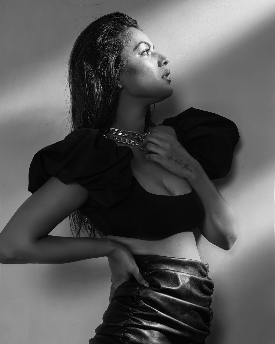 Nia Sharma looks scorching as ever in a black crop top and ruched faux leather skirt