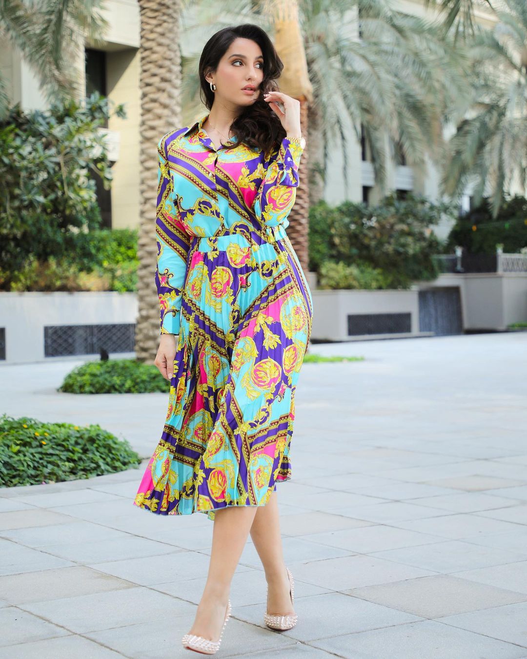 Nora Fatehi is a striking sight in the colourful pleated outfit
