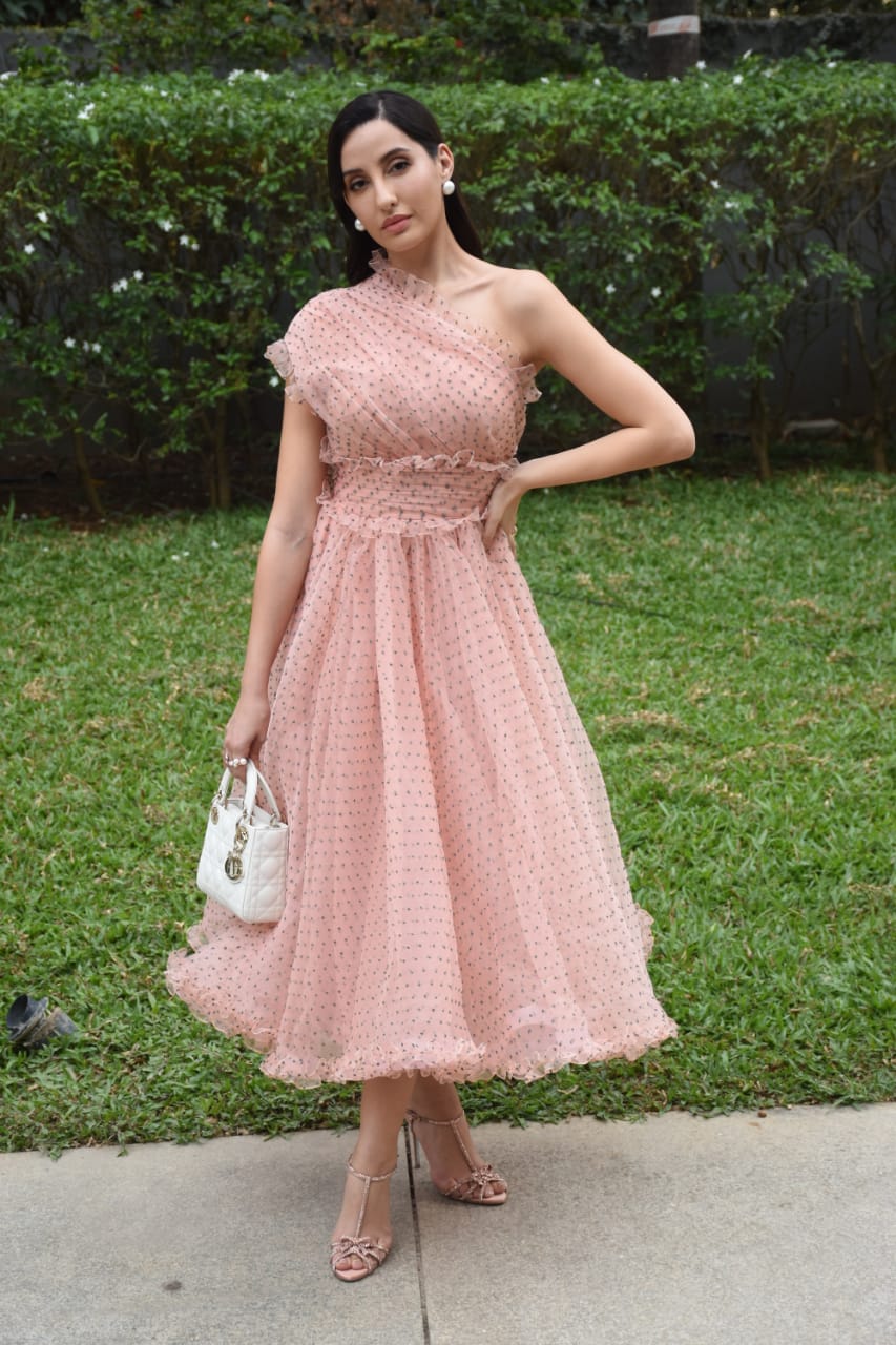 Nora Fatehi makes heads turn in a pink shimmery bodycon gown.