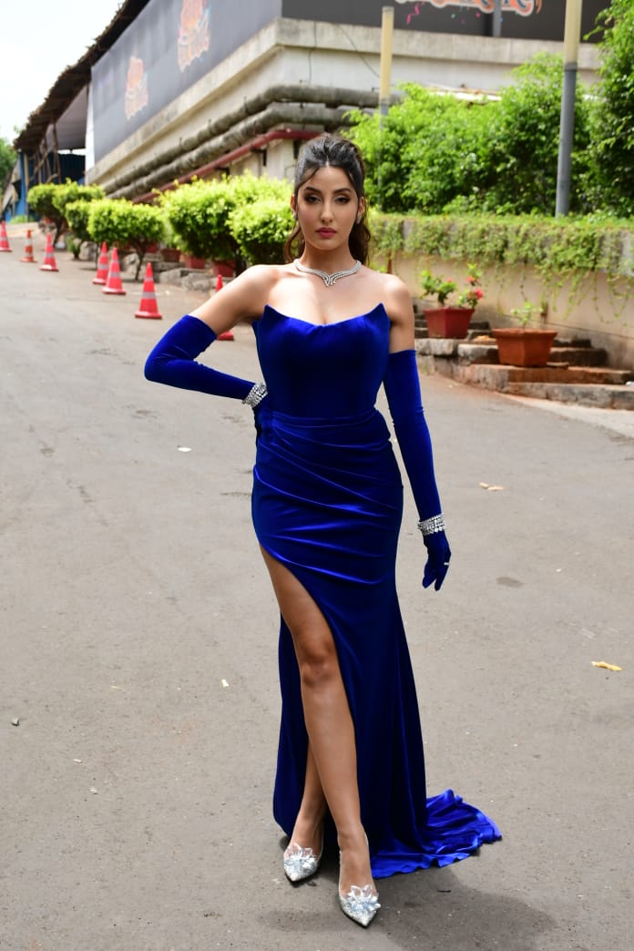 Nora Fatehi was a picture of elegance in the off-shoulder blue velvet gown