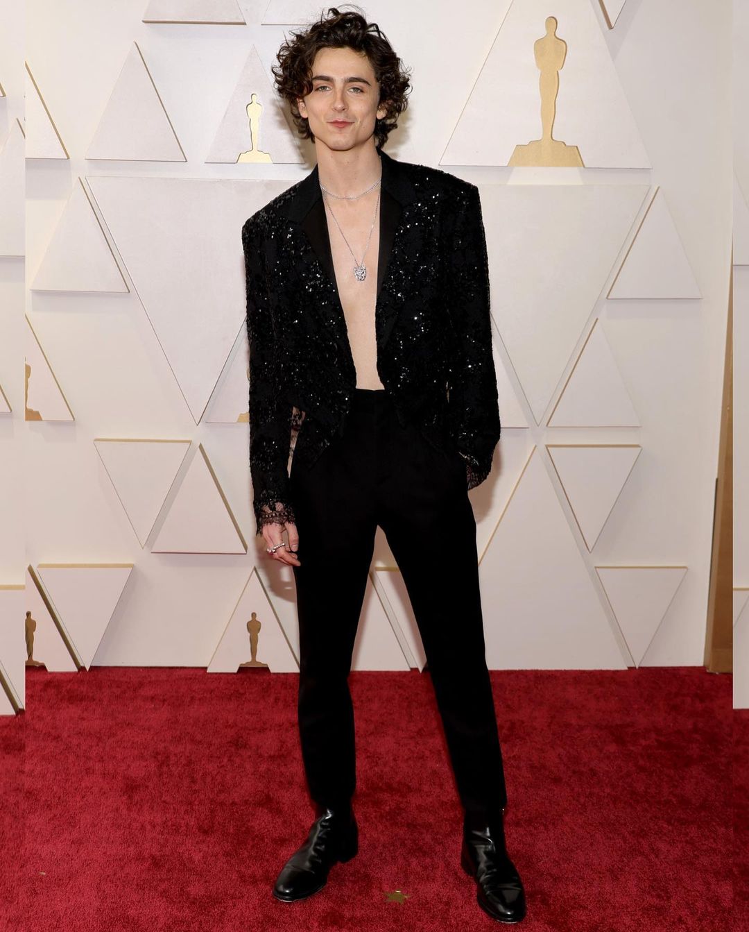 Timothee Chalamet shows some chest in a shirtless custom outfit by Louis Vuitton