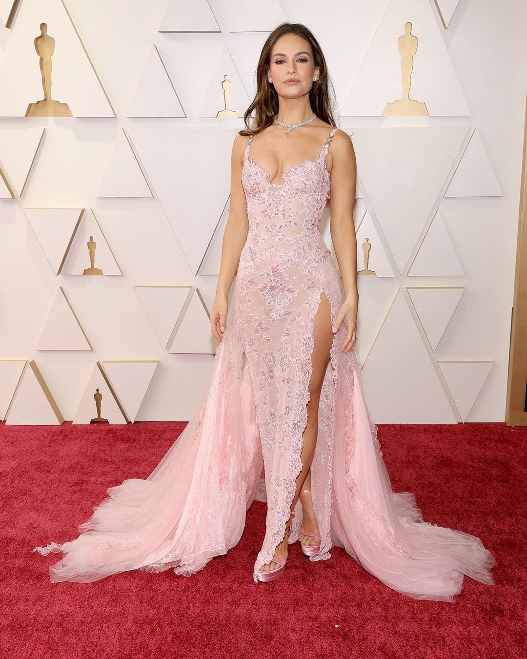 Lily James looks beautiful in the pastel pink Atelier Versace dress