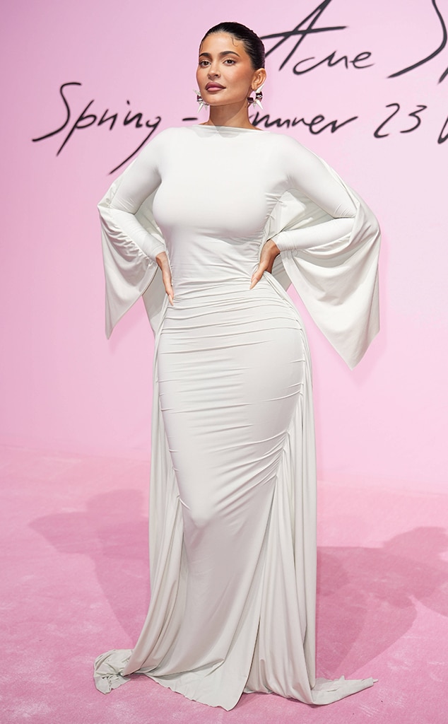 Kylie Jenner stunned in a flowy, full-length white gown while attending ACNE’s Paris Fashion Week show
