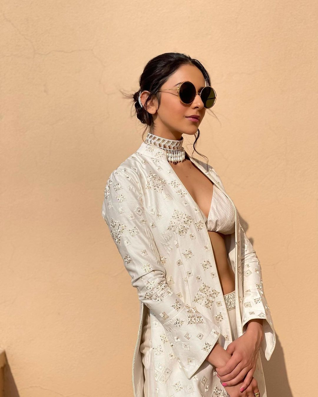Rakul Preet Singh cuts a statusque figure in the white lehenga with a matching jacket