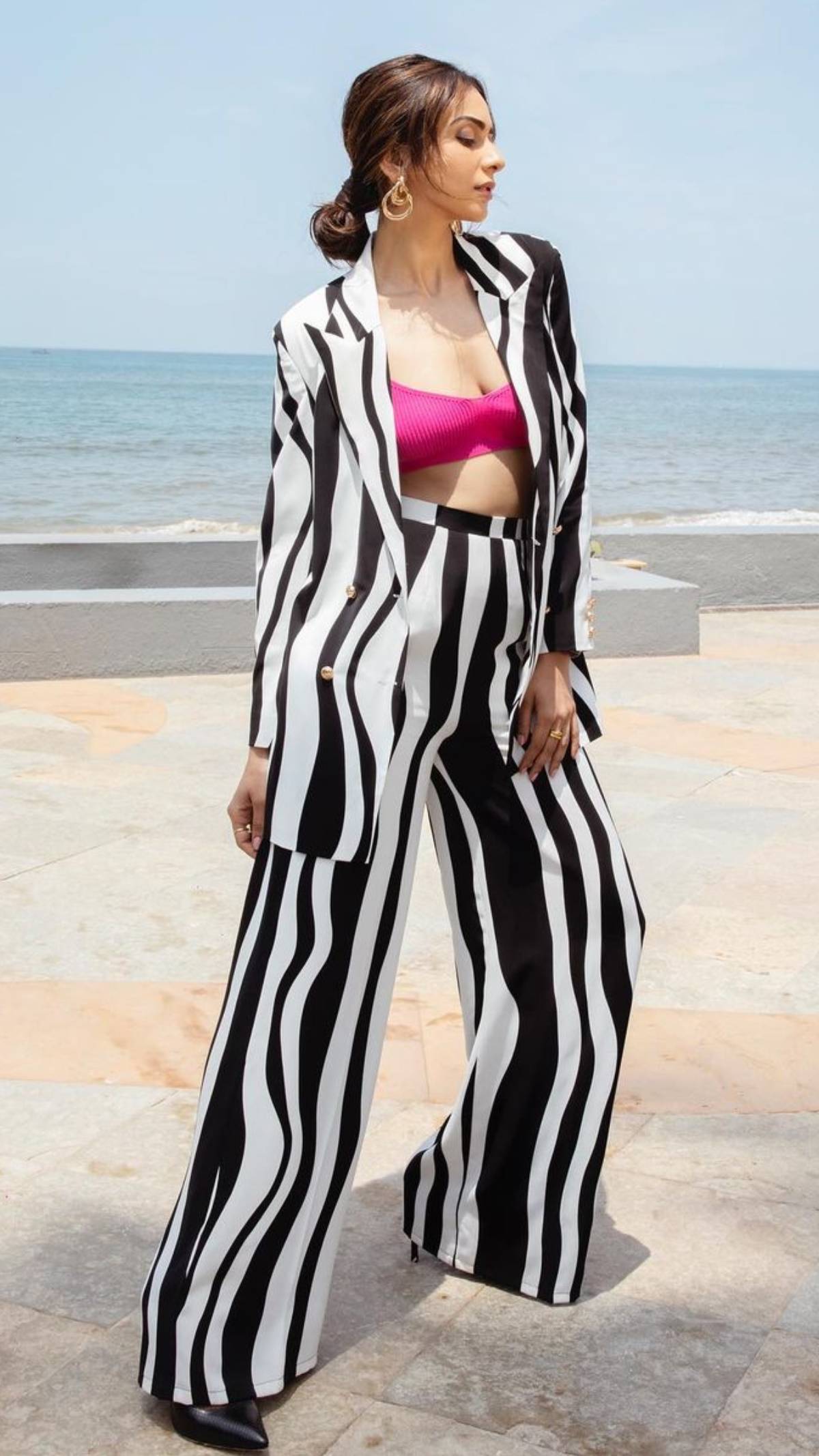 Rakul Preet Singh looks chic in a monochome suit with a pink bralette