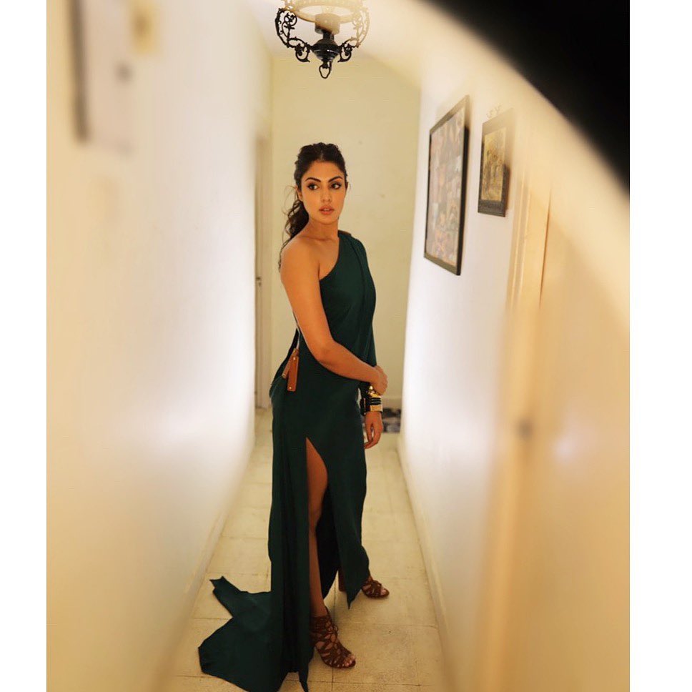 Rhea Chakraborty cuts a sensuous figure in the one-shoulder green dress