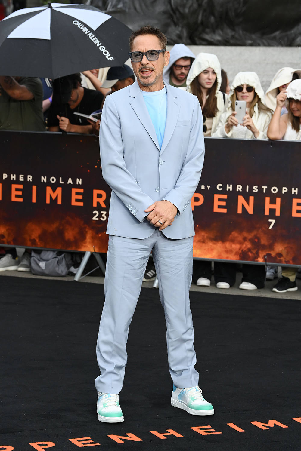 • Robert Downey Jr. looked cool and casual in this light blue suit with a pair of blue sneakers & sunglasses at an ‘Oppenheimer’ film photocall in London