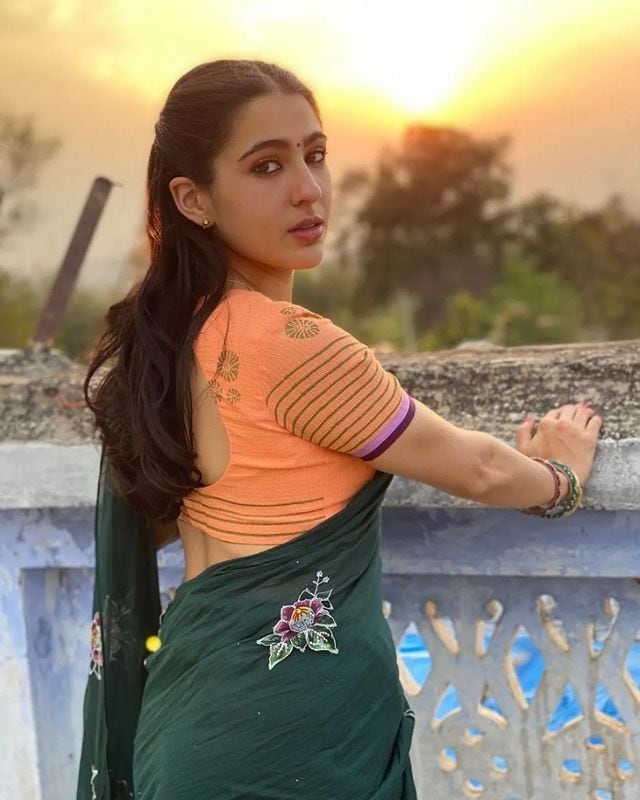 Sara Ali Khan cuts a striking figure in the orange saree.
