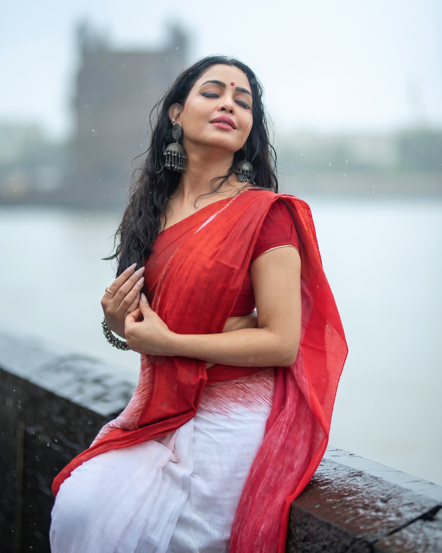 Shubhangi Atre, Indian TV actress, wearing red and white sari, Saranya Chaudhary.