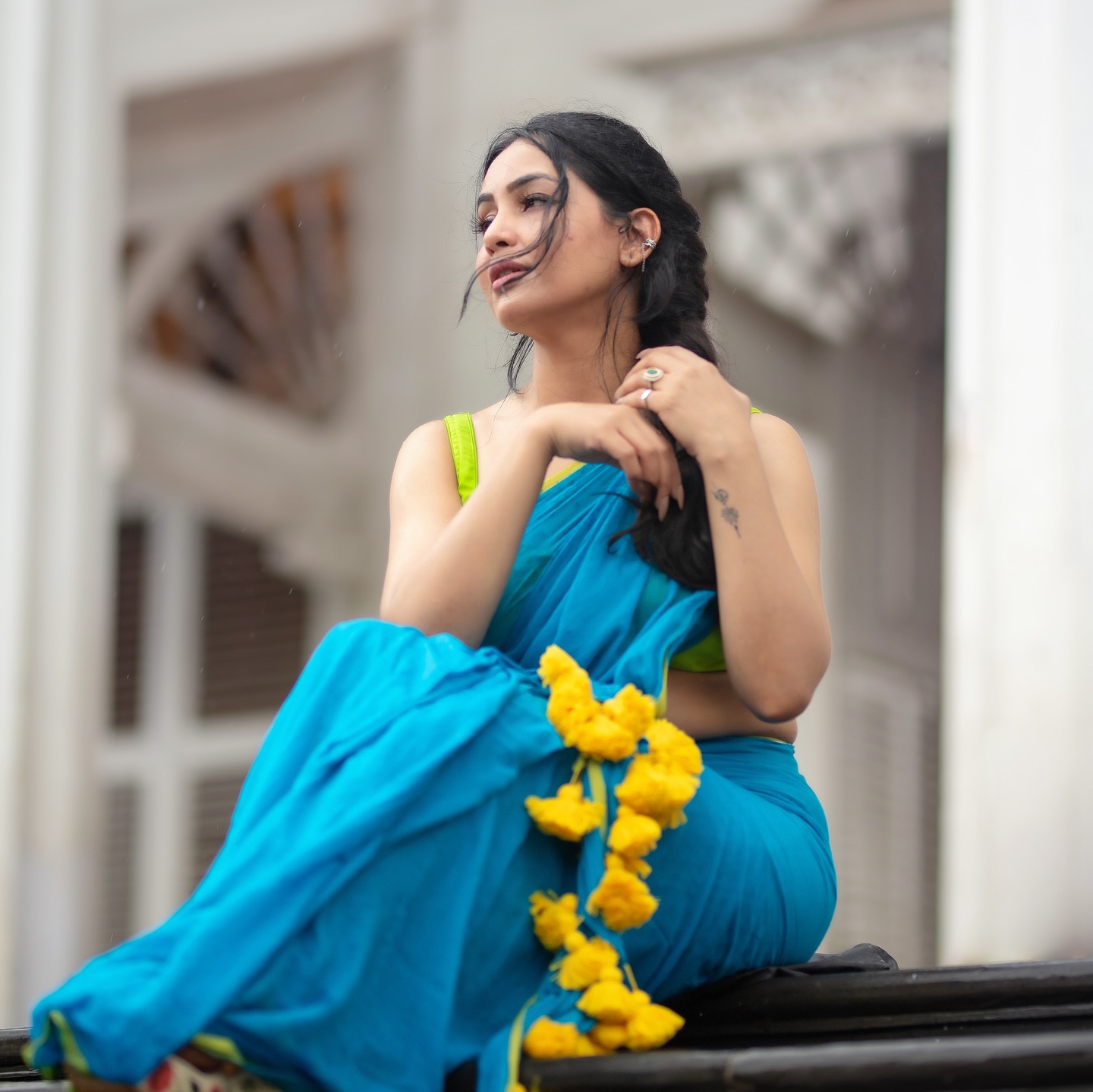 Shubhangi Atre, an Indian television actress, sits on steps wearing a blue sari, embodying grace and traditional beauty